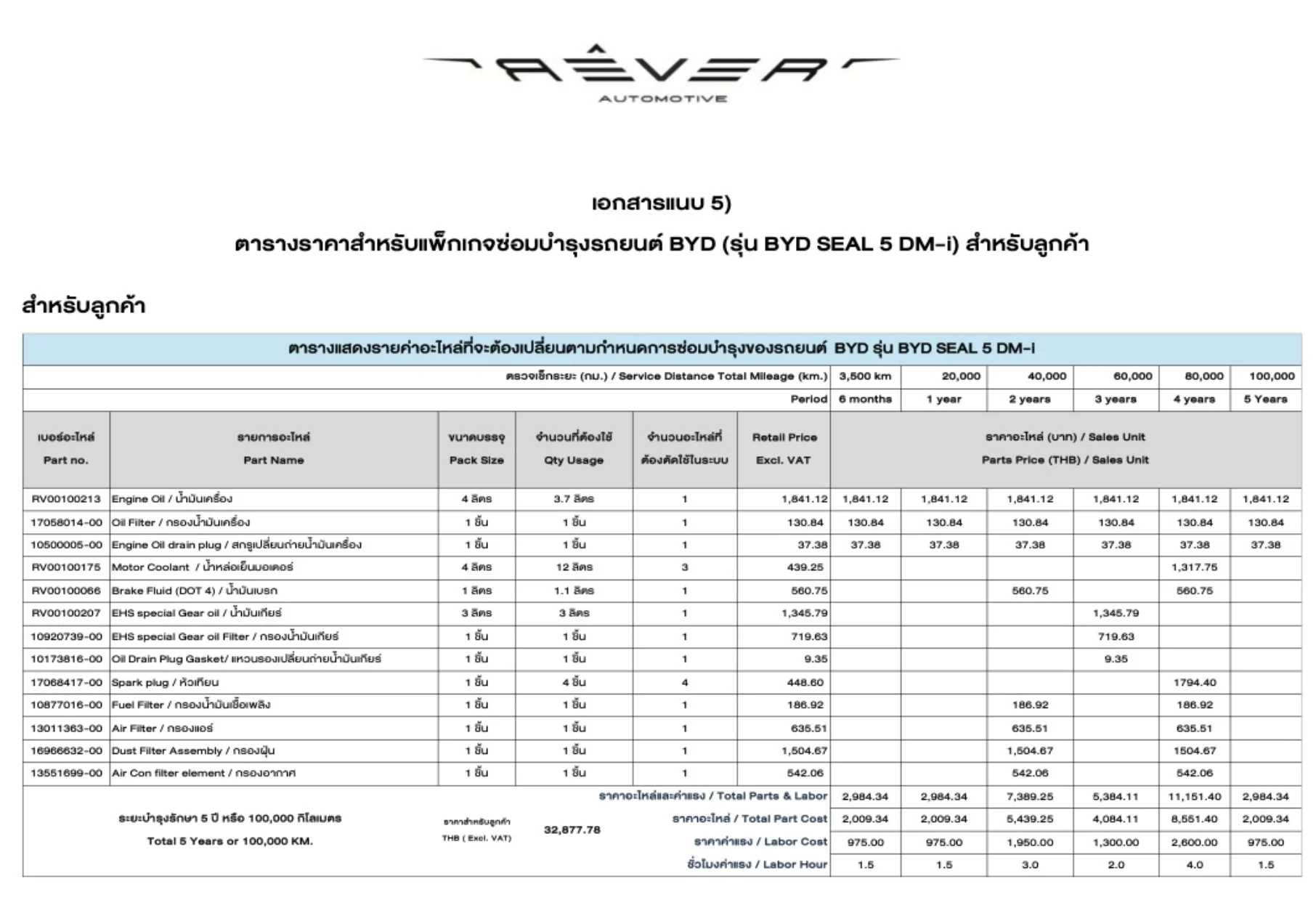 ตารางด้านล่างนี้คือรายละเอียดค่าอะไหล่และบริการตามกำหนดการซ่อมบำรุงอย่างเป็นทางการจาก Rever Automotive สำหรับ BYD SEAL 5 DM-i ของคุณโดยเฉพาะ