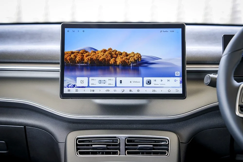 BYD SEAL 5 DM-i รุ่น Premium ยกระดับความหรูหราและความสะดวกสบายด้วยหน้าจอสัมผัสแบบหมุนได้เช่นกัน แต่มีขนาดที่ใหญ่ขึ้นเป็น 12.8 นิ้ว มอบประสบการณ์การใช้งานที่เต็มตาและชัดเจนกว่า